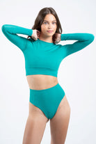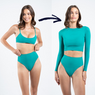 Stay protected and elegant with our UPF50+ Sunshield Top. This long sleeve crop top is designed to be worn over your swimsuit or bikini, perfectly matching in style and colour. Crafted from high-quality, sun-protective fabric, it blocks over 98% of harmful UV rays, ensuring you stay safe under the sun. Ideal for swimming or watersports like surfing or paddle boarding. When wet, it serves as an excellent cooler outside of the water, making it perfect for boat trips where sun protection is essential. Additionally - wet or dry - it provides protection from the wind, ensuring comfort in varying conditions. The sleek design adds a touch of elegance to your beachwear, ensuring you look and feel great all day long while staying protected.